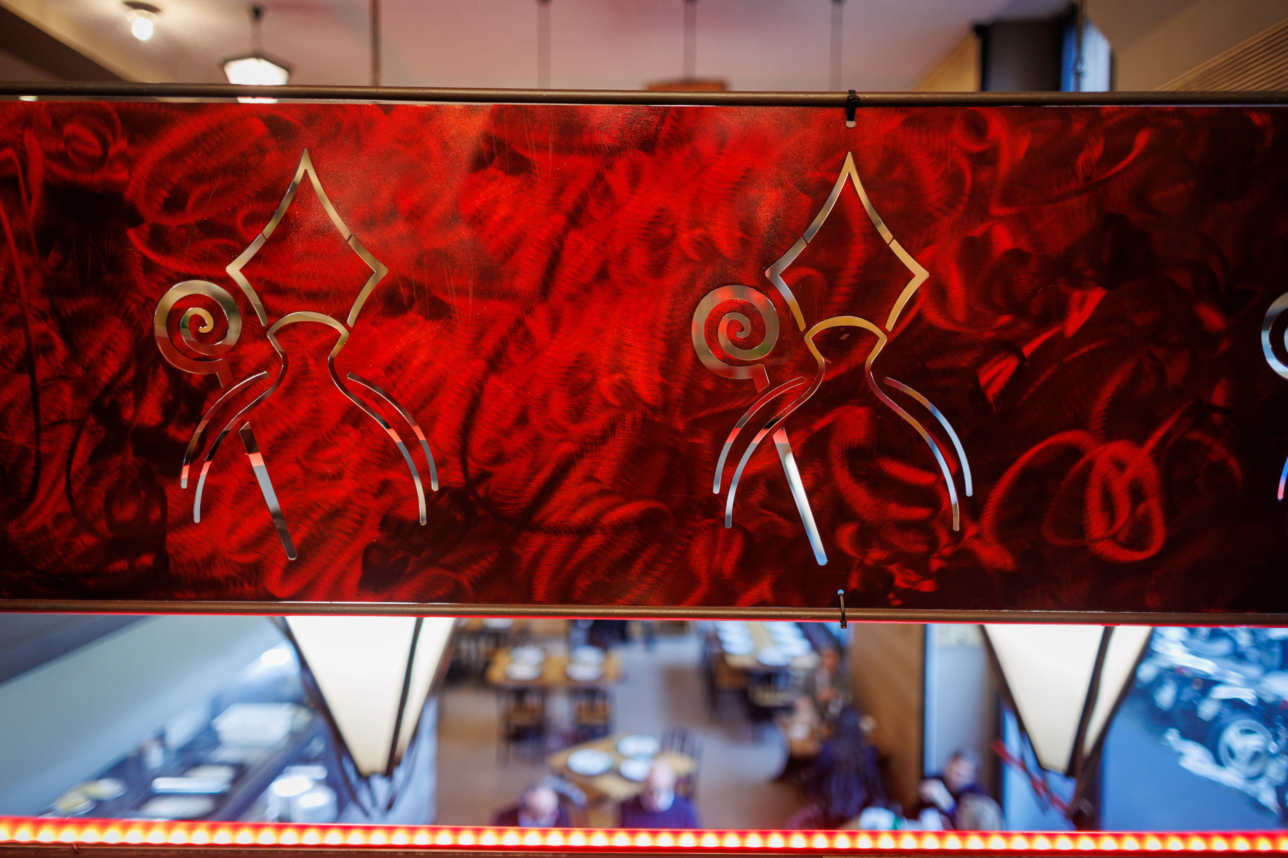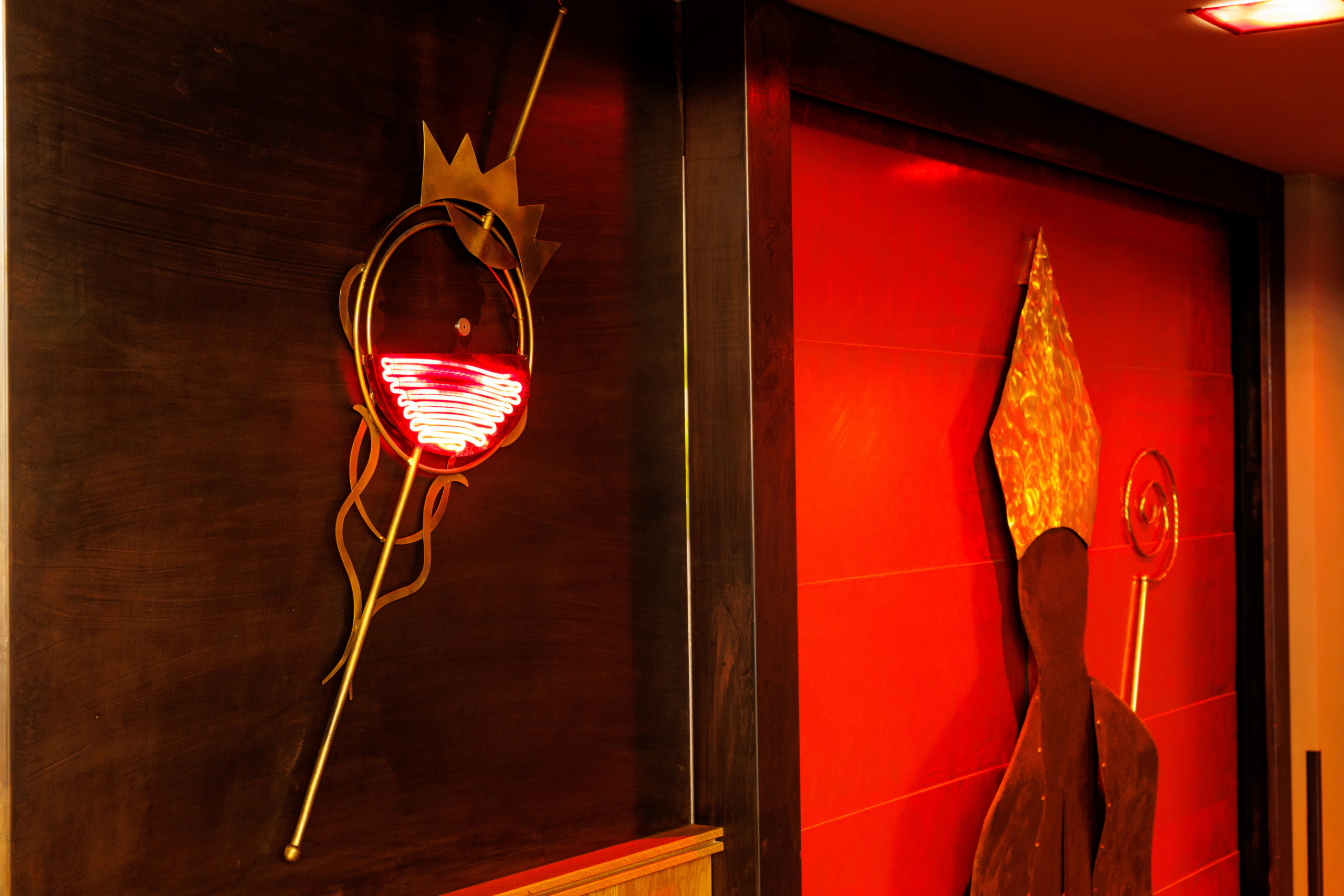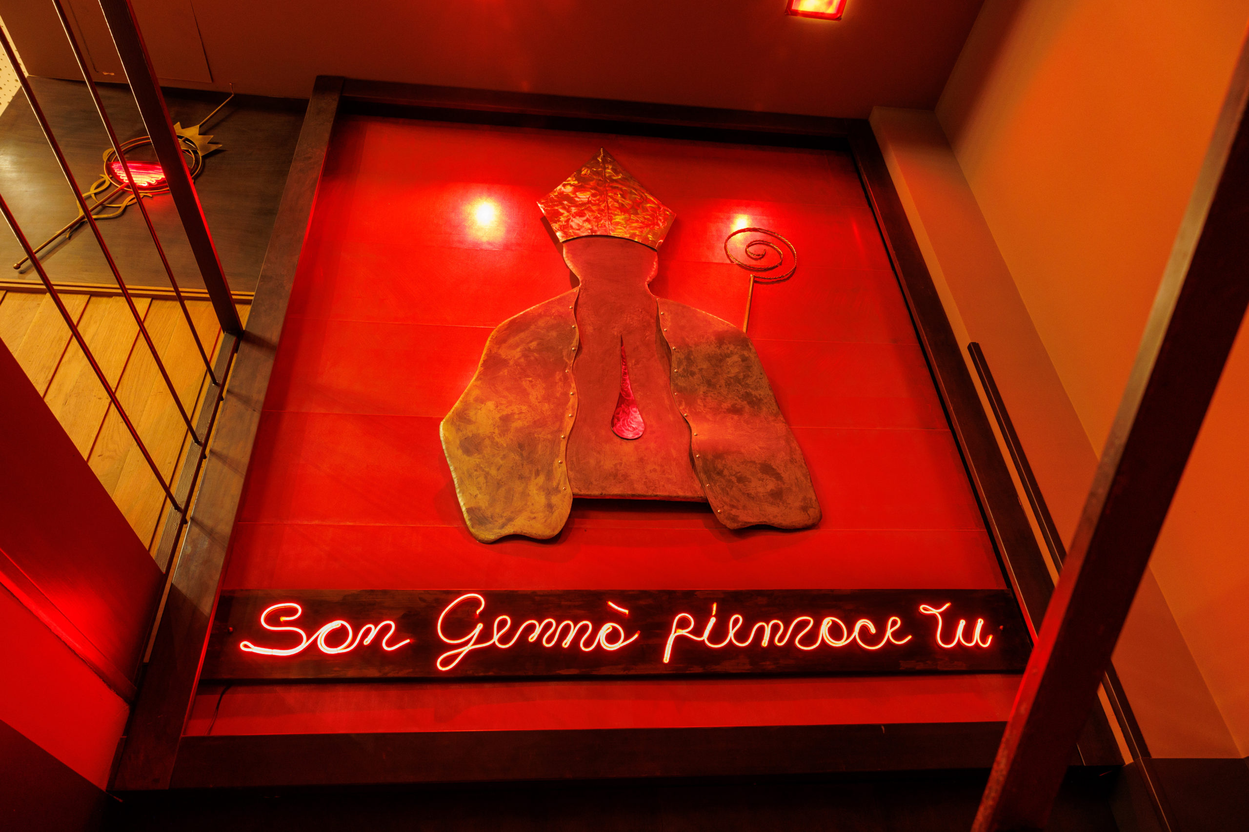 Sulla parete, il simbolo del Santo Patrono veglia silenzioso: un omaggio al cuore sacro e generoso di Napoli, che dà carattere e identità a questa sala speciale.